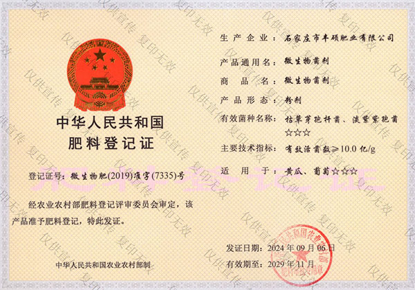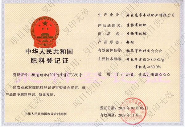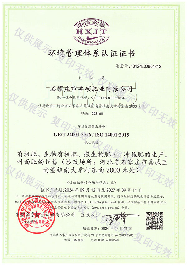 石家莊市豐碩肥業(yè)有限公司是一家集新型肥料的研發(fā)、制造、營(yíng)銷、服務(wù)于一體的高新技術(shù)企業(yè),公司自2008年創(chuàng)辦以來(lái),一直致力于新型肥料的技術(shù)研發(fā)和市場(chǎng)推廣。公司組建了豐碩新型肥料研究中心(院士專家企業(yè)工作站),自主知識(shí)產(chǎn)權(quán)研發(fā)團(tuán)隊(duì)專業(yè)科研人員20余人,獲得了多項(xiàng)肥料國(guó)家發(fā)明專利。公司目前已擁有發(fā)酵類有機(jī)肥、微生物菌劑、生物有機(jī)肥、土壤調(diào)理劑、大量元素水溶肥、含腐植酸肥料、含氨基酸肥料、中微量元素肥料等8大品類,“金維克”、“豐碩沃農(nóng)”等2大自有品牌,擁有20多個(gè)暢銷品種。目前,我公司已經(jīng)通過(guò)了“ISO9001 質(zhì)量管理體系認(rèn)證”、“ISO14001 環(huán)境管理體系認(rèn)證”、“OHSAS18001 職業(yè)健康管理體系認(rèn)證”。...